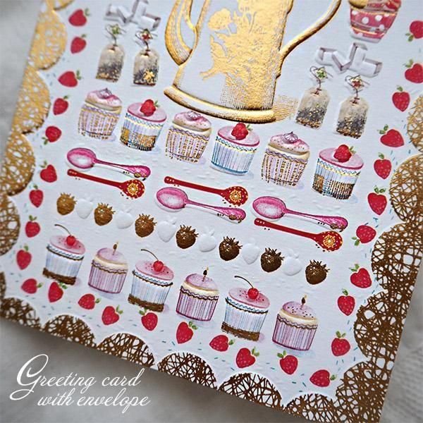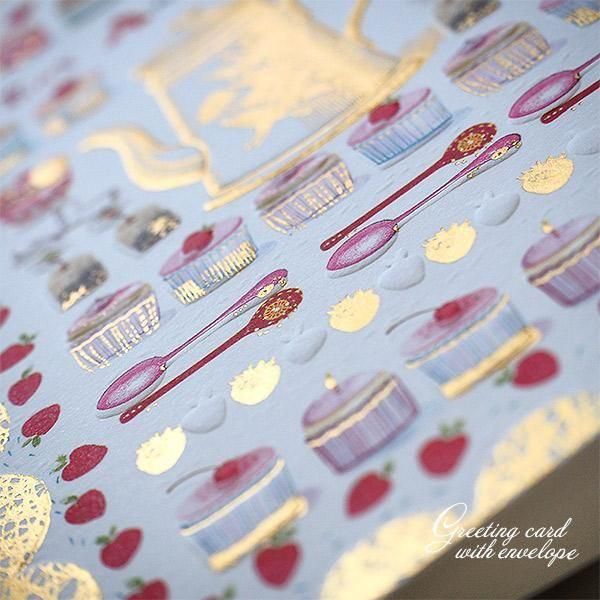 ケーキやいちご、ティーポット、レースペーパーなどのモチーフが